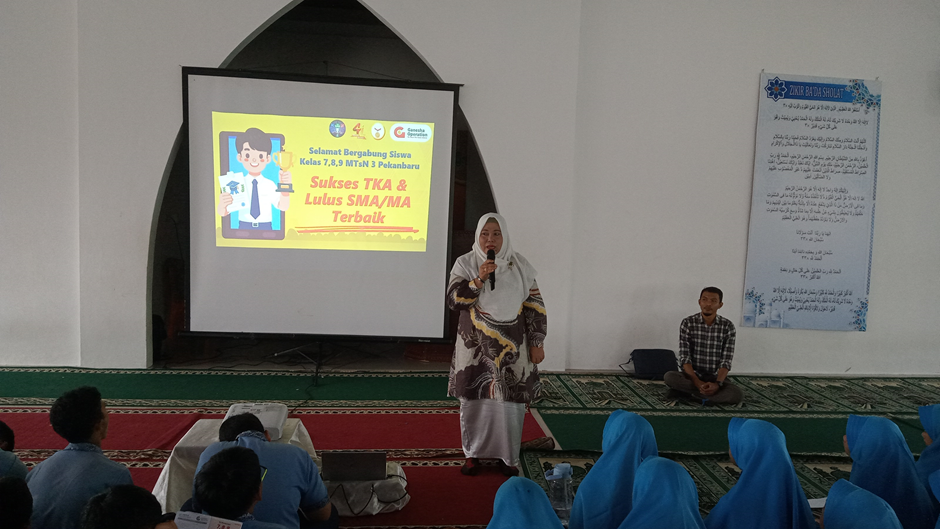 (HUMAS) – MTsN 3 Kota Pekanbaru mengadakan seminar TKA (Tes Kemampuan Akademik) yang di taja oleh GO ( Ganesha Operation) yang bertemakan Sukses TKA & Lulus SMA/MA Terbaik diikuti oleh seluruh siswa kelas VII, VIII dan IX pada hari Kamis (11/12/2025) di Masjid Baitul Ikhlas MTsN 3 Kota Pekanbaru dimulai dari jam 07.30 – Selesai.