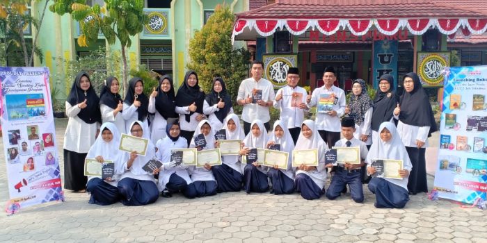 Buku-buku yang diluncurkan berjumlah 8 buku, salah satunya adalah buku karya Siswa/i MTsN 3 Pekanbaru yang berjudul “Merangkai Alenia Putih Dongker”