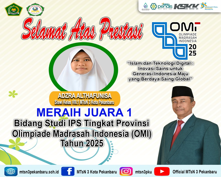 (HUMAS) – Tahniah dan Selamat atas Prestasi Siswa MTsN 3 Kota Pekanbaru meraih juara 1 Bidang Studi IPS Tingkat Provinsi Olimpiade Madrasah Indonesia (OMI) Tahun 2025, Adzra Althafunisa siswa kelas VIII.1 Mata Pelajaran IPS, Tahniah dan Mohon Do’a dan dukungan dari semua agar diberikan kelancaran, kemudahan, serta hasil terbaik di tingkat Nasional, kepada Ananda Adzra yang telah berprestasi.