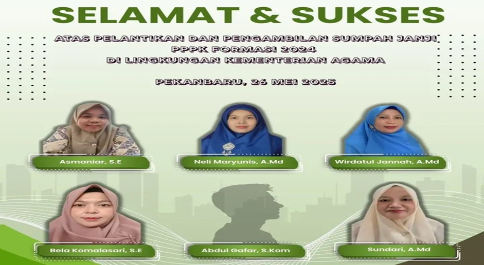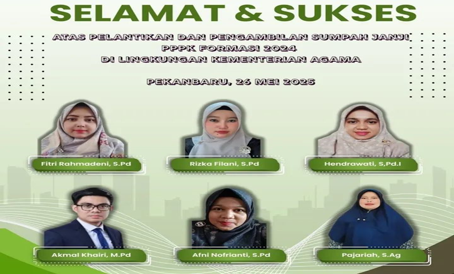 (HUMAS) –  Ucapan Tahniah Selamat dan Sukses diberikan kepada 6 orang Guru dan 6 orang Tenaga Kependidikan atas pelantikan dan pengambilan sumpah janji PPPK Formasi 2024 di lingkungan Kementerian Agama kota Pekanbaru yang dilaksanakan di Aula besar MAN 1 Kota Pekanbaru, pada hari Senen (26/05/2025) dimulai dari jam 13.30 sampai Selesai,.