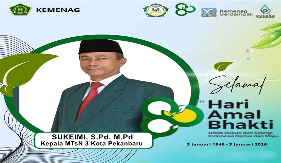 (HUMAS) – MTsN 3 Kota Pekanbaru mengadakan upacara Peringatan HAB (Hari Amal Bhakti) RI yang ke – 80 di lapangan MTsN 3 Kota Pekanbaru yang diikuti oleh Majelis Guru, Karyawan Tata Usaha, dan Siswa – Siswi MTsN 3 Kota Pekanbaru , pada Hari Senen (05/01/2026). Pada kesempatan HAB RI yang ke – 80 Anggota OSIM sebagai Personel Upacara. Waka Kurikulum Ibuk Rifka Yulimarwina, M. Pd ditunjuk sebagai Pembina Upacara.